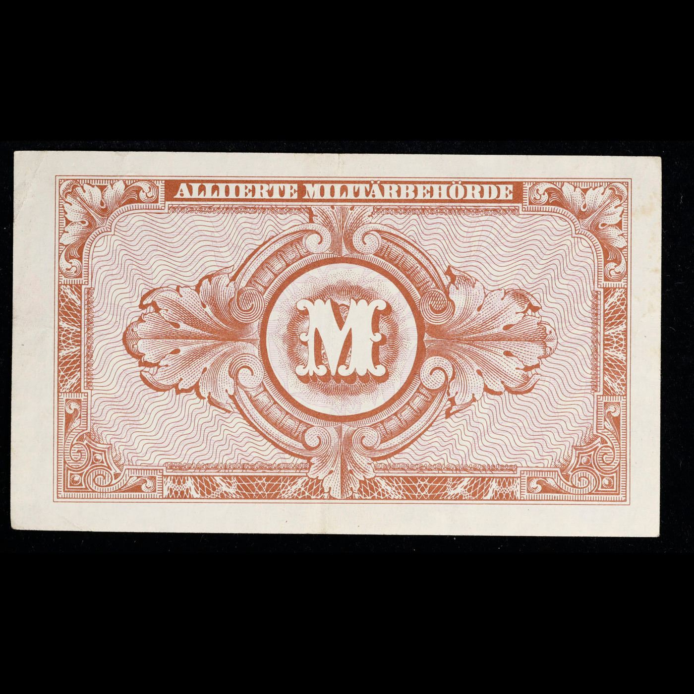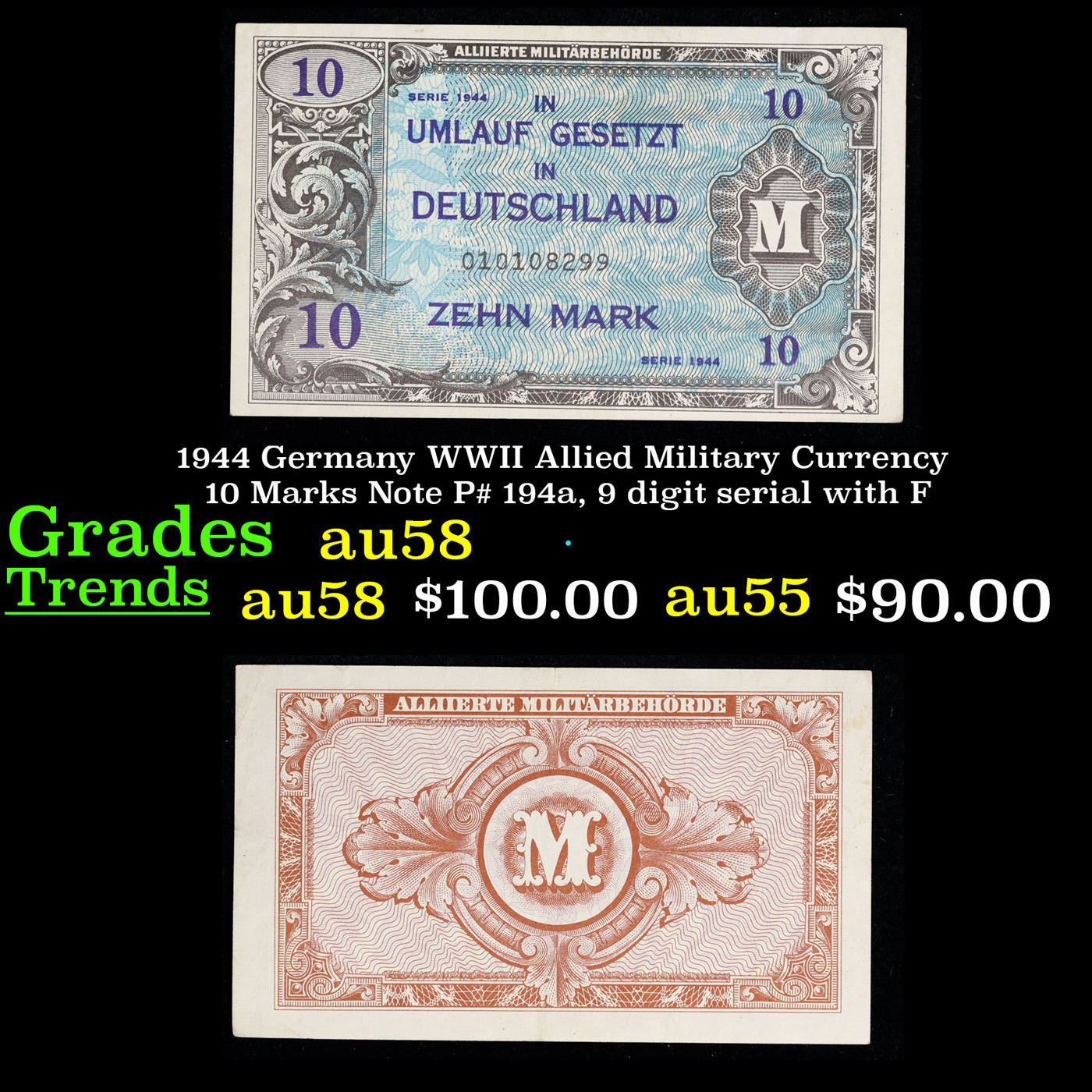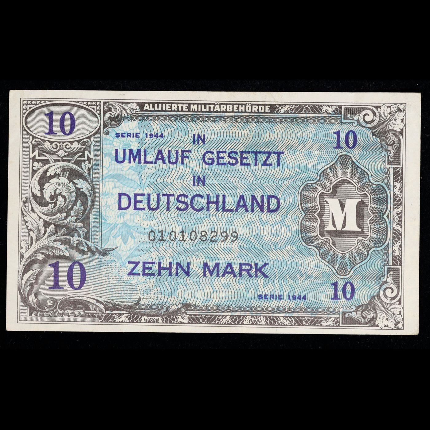 1944 Germany WWII Allied Military Currency 10 Marks Note P# 194a, 9 digit serial with F Grades Choice AU/BU Slider. The AM-Mark ("Allied Military Currency") was the currency issued in Allied-occupied Germany by AMGOT after the commencement of Operation Wild Dog in 1944. There were individual prefix identifications for Occupation zones (USA > 1, British > 0, French > 00, Russian > -). These notes circulated through mid 1948. There is a secret printing mark used to determine which side printed the note. For the Americans this is a stylized "F" for the printer, Forbes Lithographic, which appears on the 1/2, 1, 5 and 10 mark notes in the left ball of the scroll directly below the lower right denomination value. The letter also appears on the 20, 50, 100 and 1000 marks. The Soviet Union printed identical notes but without the "F".