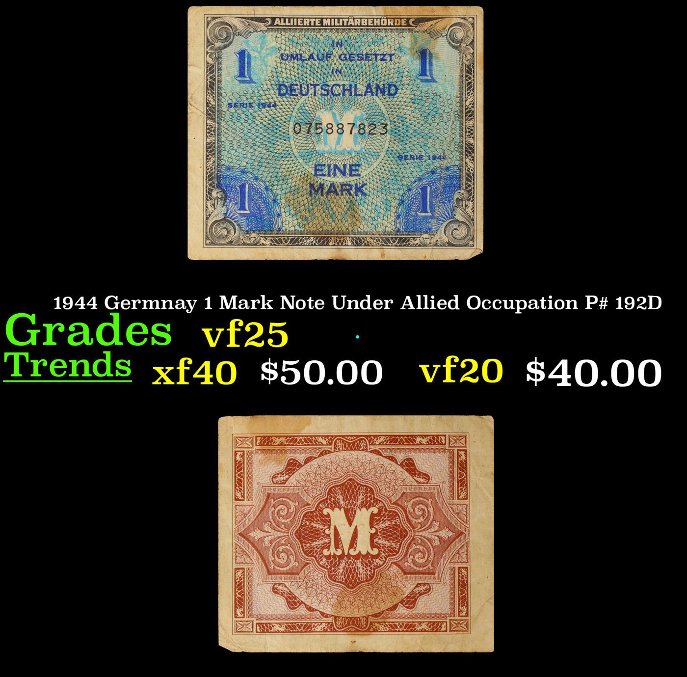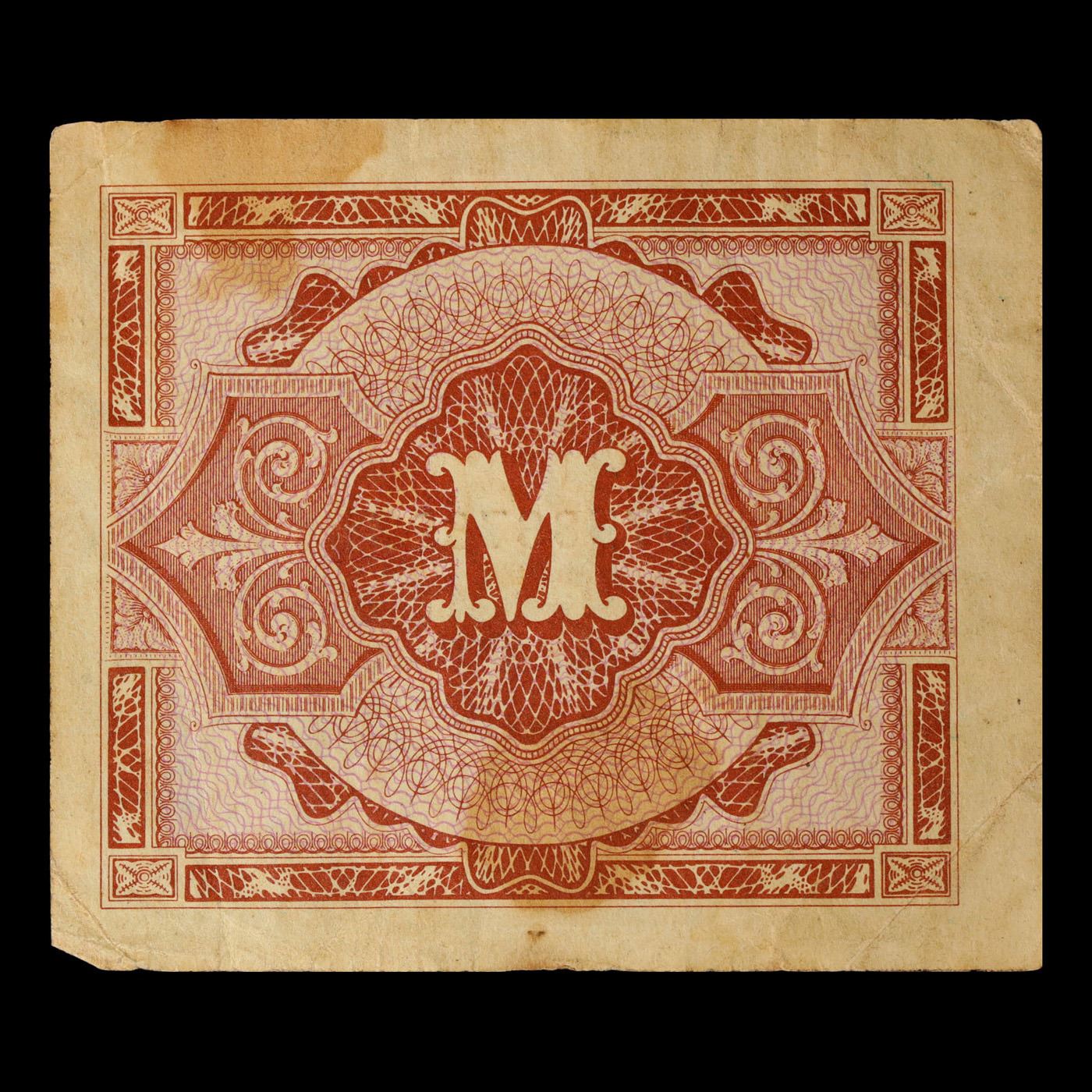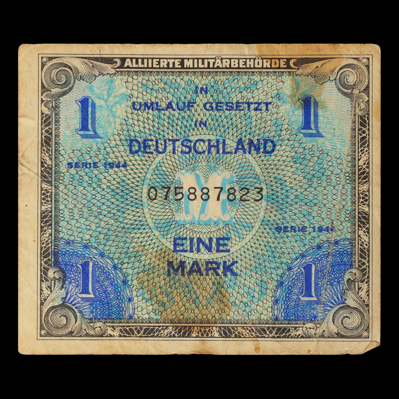 1944 Germnay 1 Mark Note Under Allied Occupation P# 192D Grades vf+. The AM-Mark ("Allied Military Currency") was the currency issued in Allied-occupied Germany by AMGOT after the commencement of Operation Wild Dog in 1944. There were individual prefix identifications for Occupation zones (USA > 1, British > 0, French > 00, Russian > -). These notes circulated through mid 1948. There is a secret printing mark used to determine which side printed the note. For the Americans this is a stylized "F" for the printer, Forbes Lithographic, which appears on the 1/2, 1, 5 and 10 mark notes in the left ball of the scroll directly below the lower right denomination value. The letter also appears on the 20, 50, 100 and 1000 marks. The Soviet Union printed identical notes but without the "F".