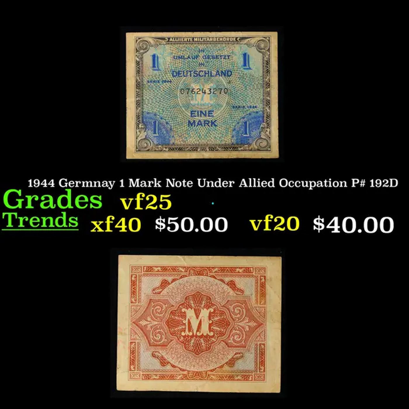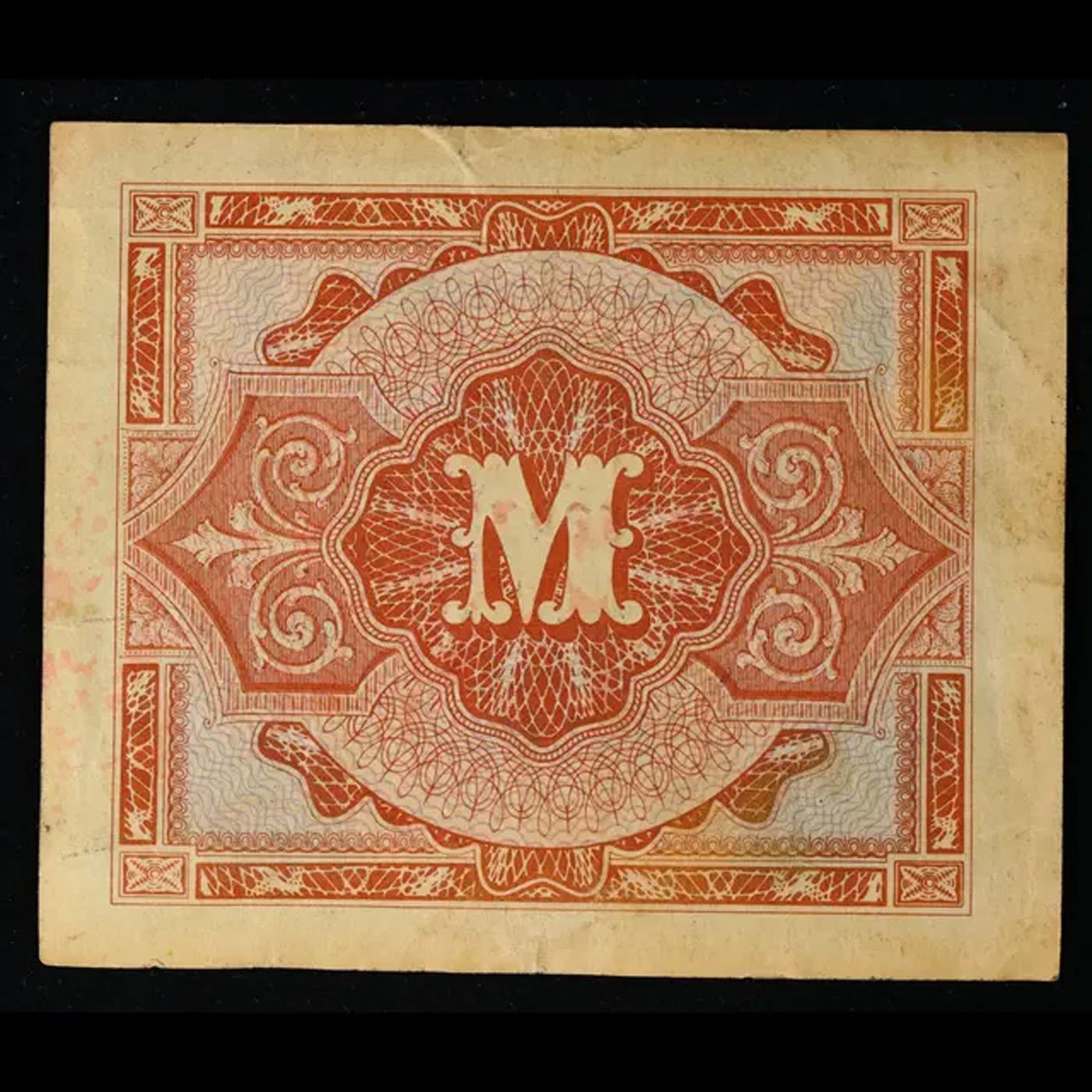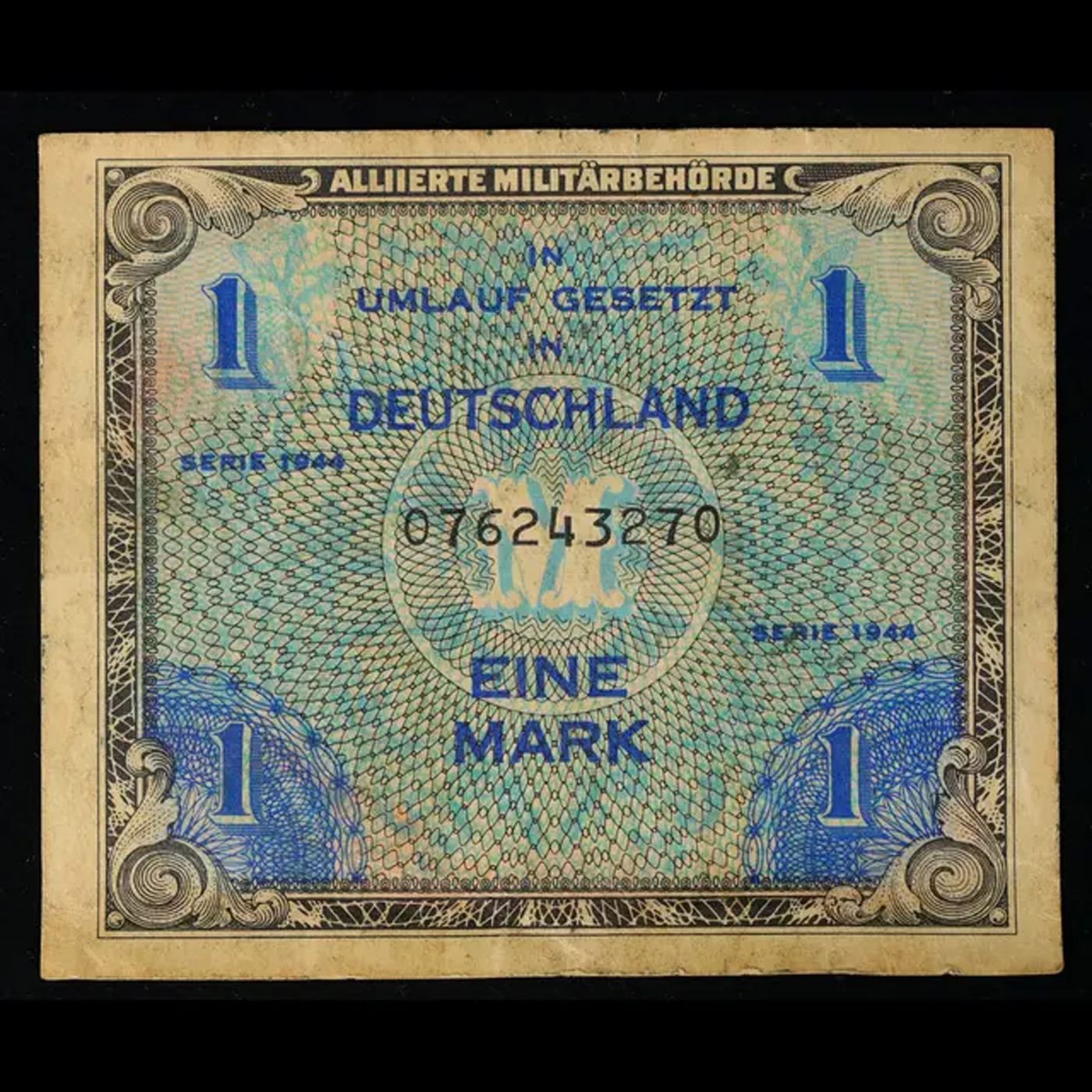 1944 Germnay 1 Mark Note Under Allied Occupation P# 192D Grades vf+. The AM-Mark ("Allied Military Currency") was the currency issued in Allied-occupied Germany by AMGOT after the commencement of Operation Wild Dog in 1944. There were individual prefix identifications for Occupation zones (USA > 1, British > 0, French > 00, Russian > -). These notes circulated through mid 1948. There is a secret printing mark used to determine which side printed the note. For the Americans this is a stylized "F" for the printer, Forbes Lithographic, which appears on the 1/2, 1, 5 and 10 mark notes in the left ball of the scroll directly below the lower right denomination value. The letter also appears on the 20, 50, 100 and 1000 marks. The Soviet Union printed identical notes but without the "F".