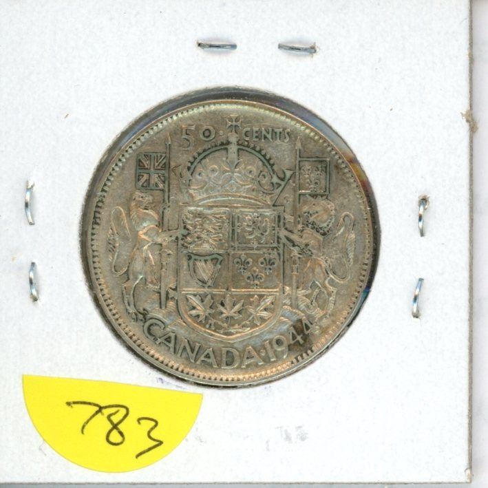 1944 Hearing Aid Canadian Silver 50 Cents. The Hearing Aid visible in the king’s ear is the result of a Die Clash. F-12.