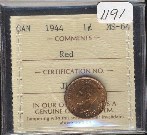 1944 ICCS MS64 Red, 90% wine red, attractive lustre! A scarce date.