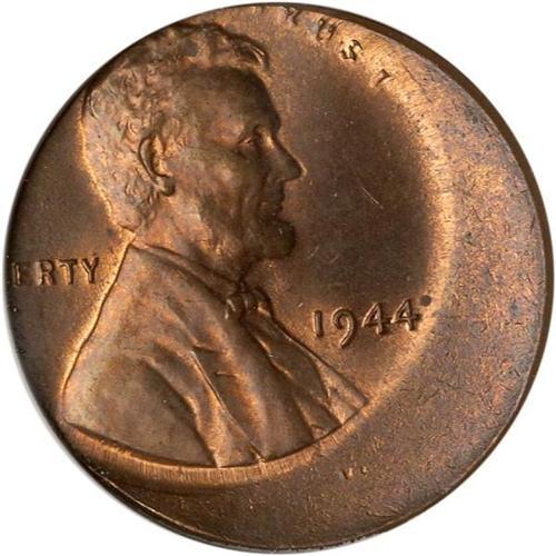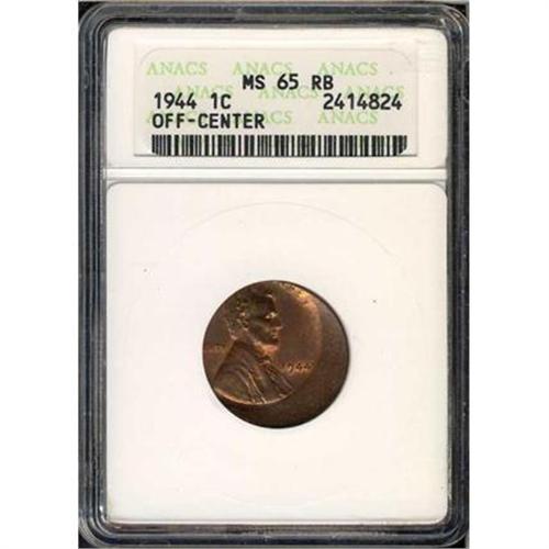 <b>1944 Lincoln Cent Error. ANACS graded MS65 RB Off-Center.</b> Struck about 30% off center at 10 o'clock, with ample mint color left on the slowly mellowing brownish surface. The 1944 (and 1945) cents are stuck in a slightly different alloy than later issues, so-called shell-case copper, from the use of discarded military shell casings in the copper-tin-zinc alloy melt <b>(PCGS # 2721)</b>