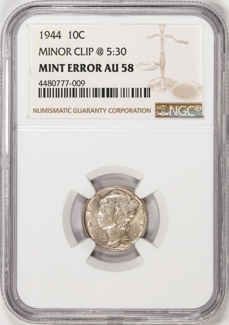 One 1944 Mercury Dime Coin Minor Clip at 5:30 NGC Mint Error AU58. NGC Certified.