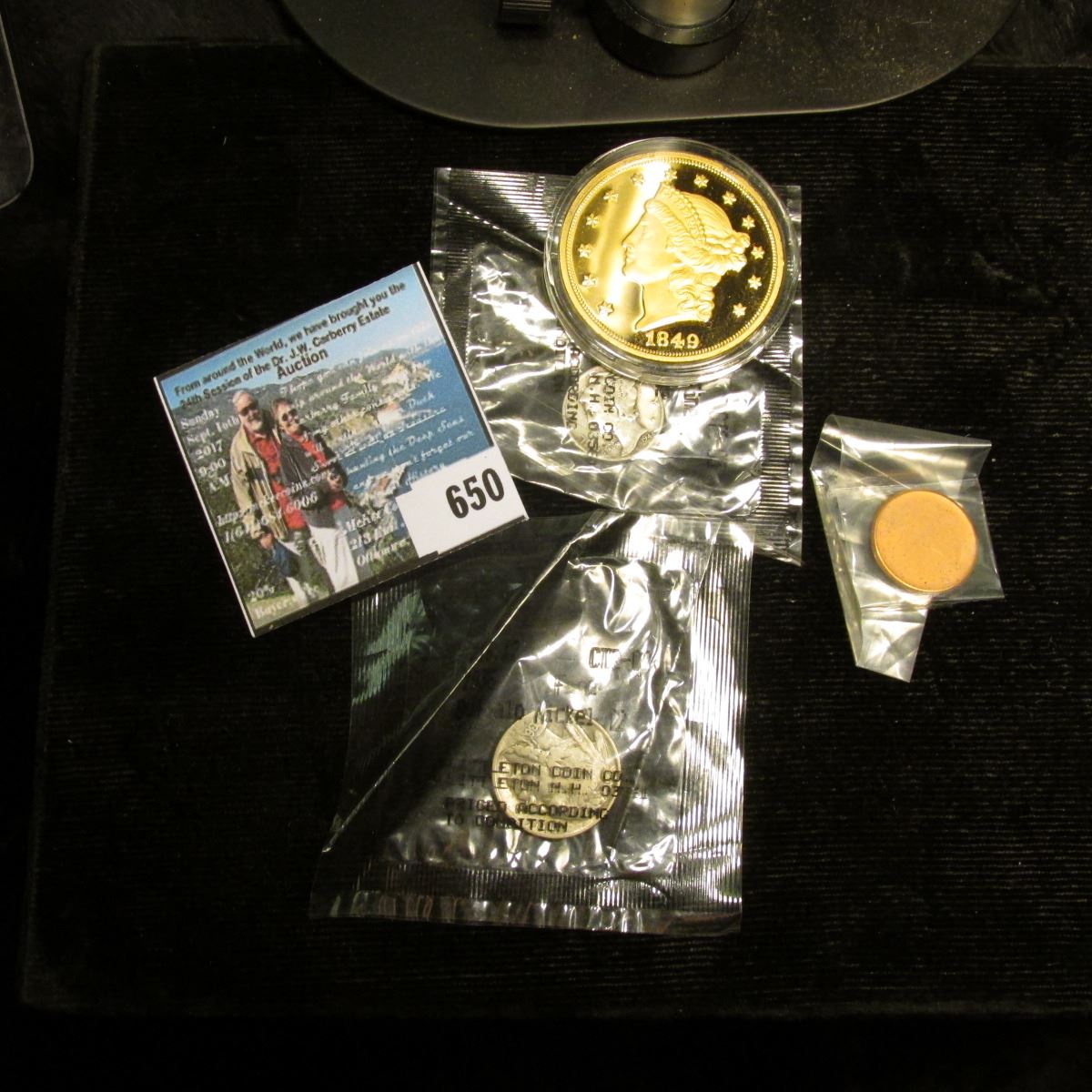 1944 Mercury Dime, Fine in a Littleton Coin holder; Lincoln Head Cent Plt Znc Blank Planchet in a Littleton Coin holder; 1936 P Buffalo Nickel, Fine in a Littleton Coin holder; & a copy of 1849 U.S. Twenty Dollar Gold Piece.
