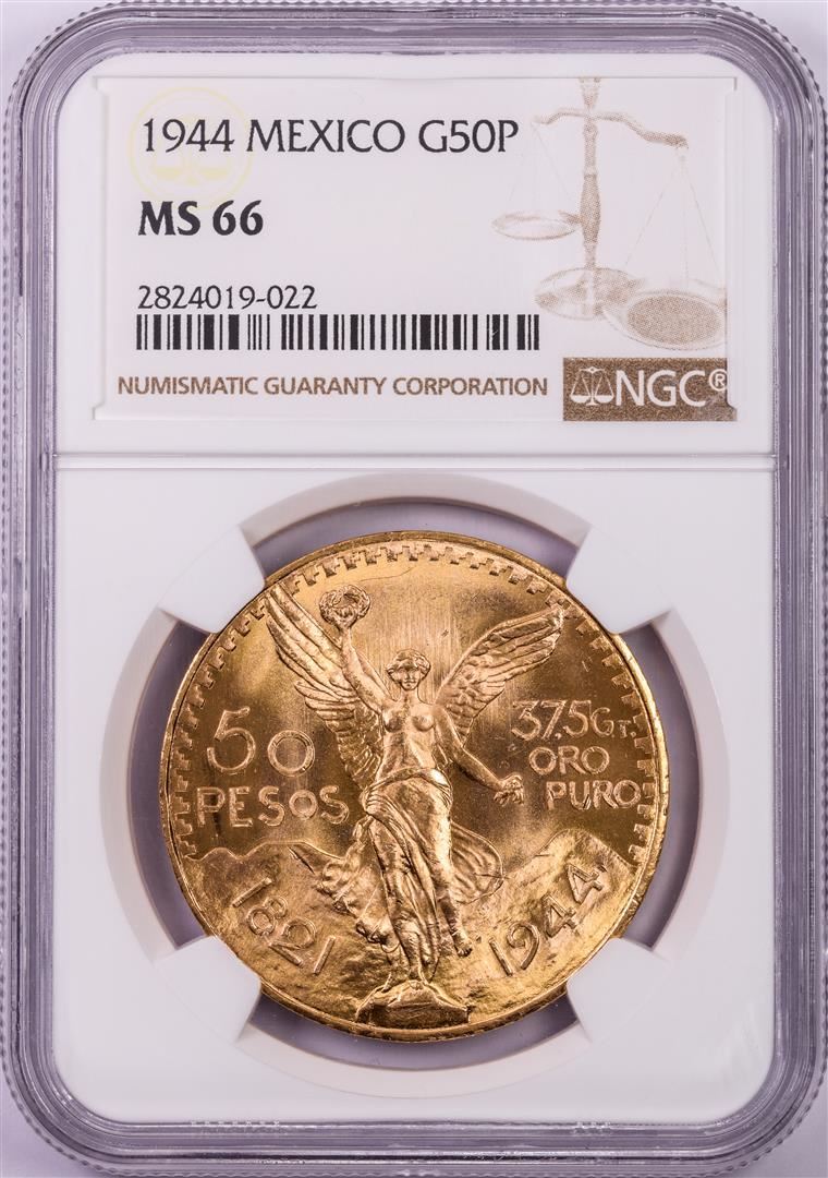 One 1944 Mexico 50 Pesos Gold Coin NGC MS66. NGC Certified.