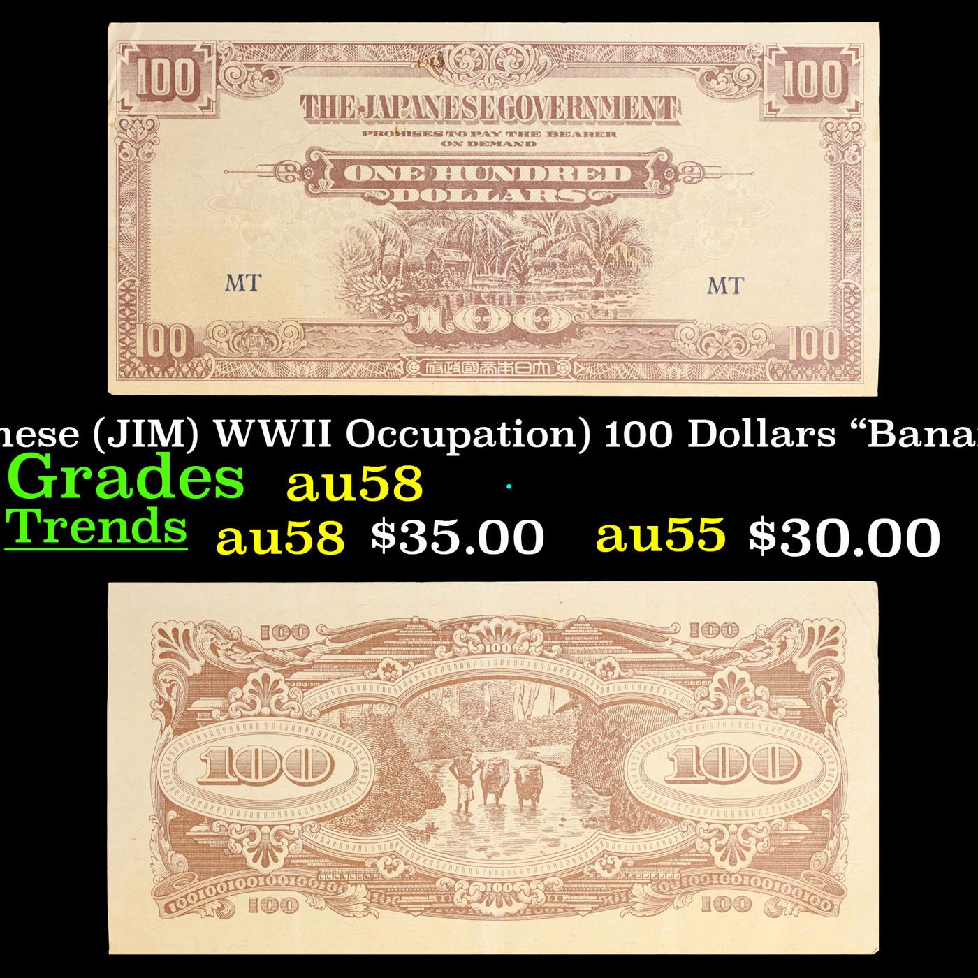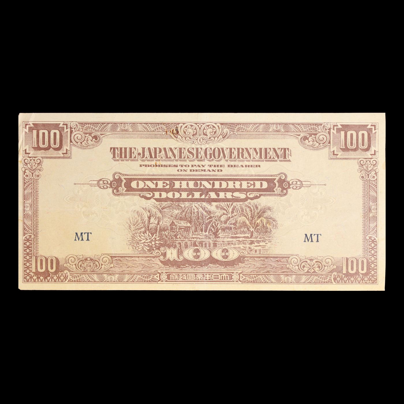 1944 Myanmar (Japanese (JIM) WWII Occupation) 100 Dollars "Banana Money" Note P# M8b Grades Choice AU/BU Slider. After Japanese forces occupied Malaya early in 1942, they introduced new currency notes. Because the $10 note carried a picture of a banana plant, the wartime currency was referred to as banana money. For the first two years of the occupation, the Japanese maintained monetary discipline and kept circulation of this currency under control. However, with the country’s trading economy at a standstill, there was little to tax and, in order to fund the civil administration and purchase supplies for the military, the Japanese began printing more and more money. In December 1940, the active circulation of currency in Malaya was 120 million dollars. By the middle of 1945, the Japanese may have printed 4,000 million dollars, and the active circulation was 30 times greater than before the war. The predictable result was hyperinflation.