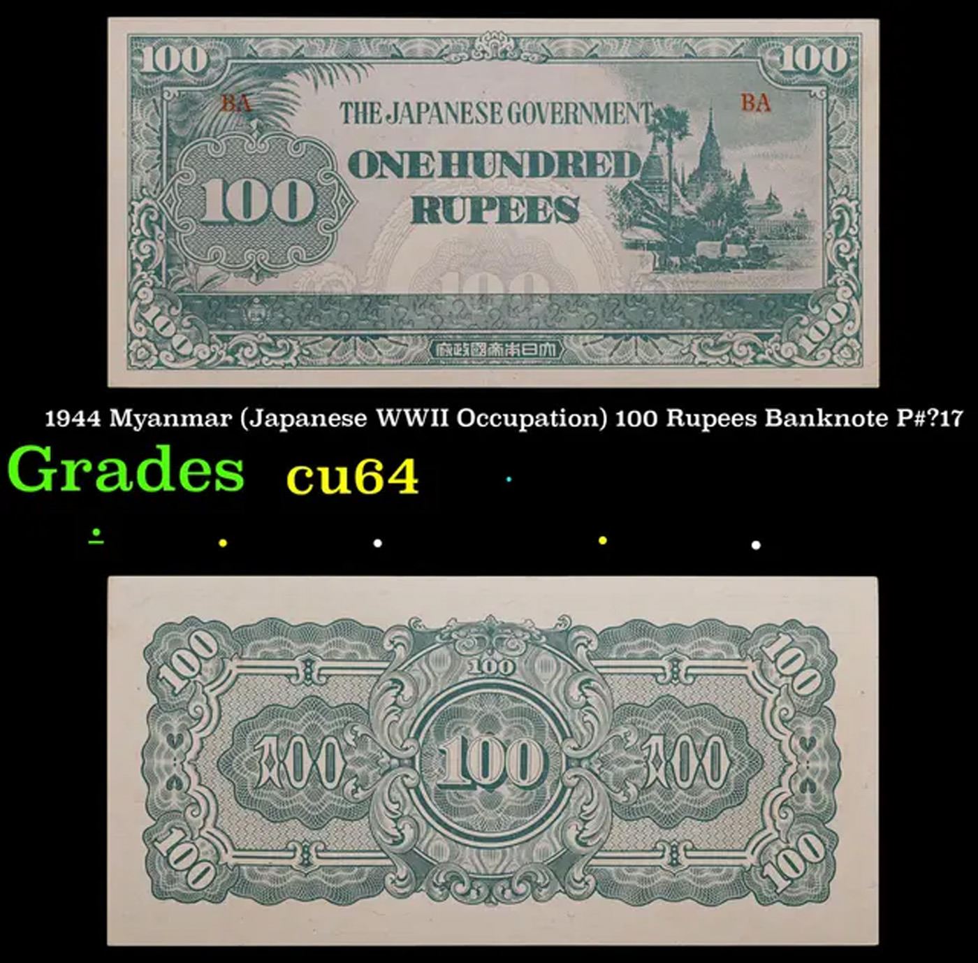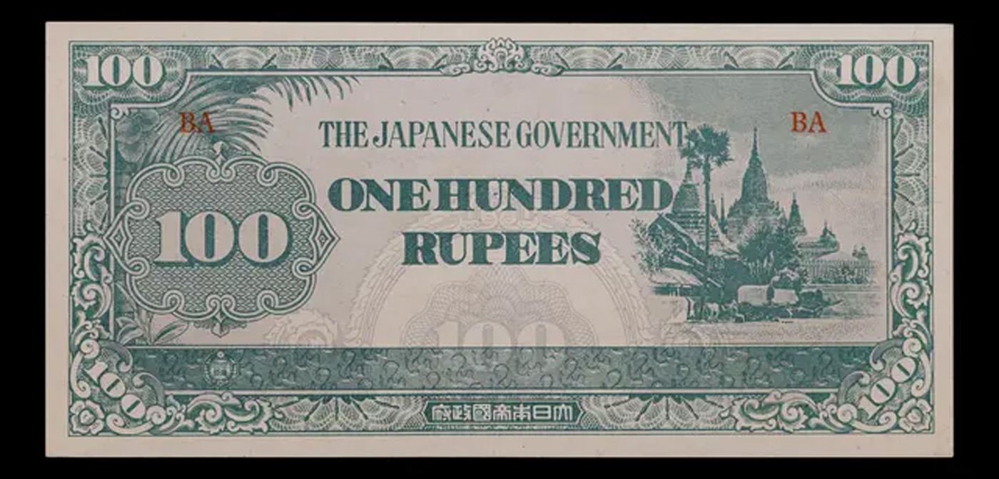 1944 Myanmar (Japanese WWII Occupation) 100 Rupees Banknote P#?17 Grades Choice CU. Japanese invasion money, officially known as Southern Development Bank Notes (Japanese: ??????? Dai T?-A Sens? gunpy?, "Greater East Asia War military scrip"), was currency issued by the Japanese Military Authority as a replacement for local currency after the conquest of colonies and other states in World War II. Japan printed this currency for many countries, including Malaysia, Singapore, North Borneo, Sarawak, Burma, Brunei, and several Oceania territories controlled by Australia. Some Japanese invasion notes are actually counterfeits produced by the American Office of Strategic Services or the British Special Operations Executive, meant to flood and destabilize the economy in the occupied areas, sometimes also including propaganda printed on the notes themselves.