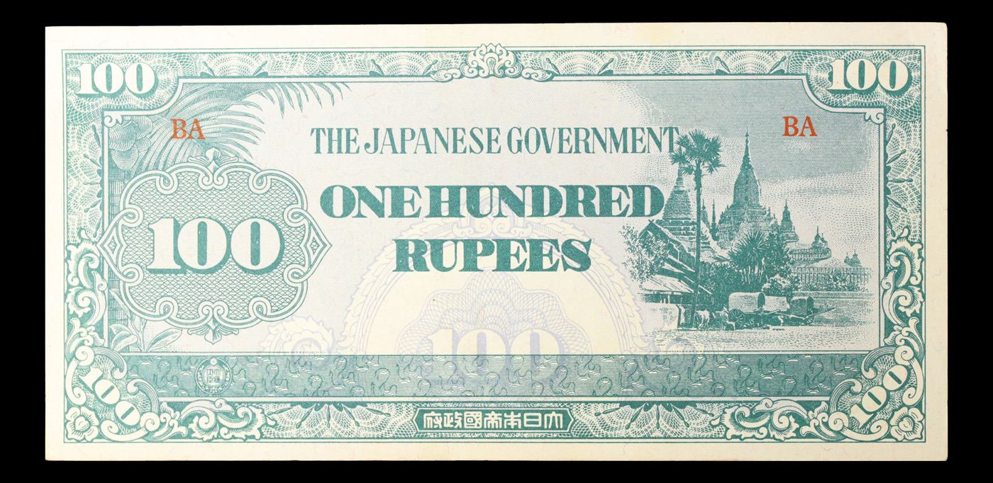 1944 Myanmar (Japanese WWII Occupation) 100 Rupees Banknote P#?17 Grades Select CU. Japanese invasion money, officially known as Southern Development Bank Notes (Japanese: ??????? Dai T?-A Sens? gunpy?, "Greater East Asia War military scrip"), was currency issued by the Japanese Military Authority as a replacement for local currency after the conquest of colonies and other states in World War II. Japan printed this currency for many countries, including Malaysia, Singapore, North Borneo, Sarawak, Burma, Brunei, and several Oceania territories controlled by Australia. Some Japanese invasion notes are actually counterfeits produced by the American Office of Strategic Services or the British Special Operations Executive, meant to flood and destabilize the economy in the occupied areas, sometimes also including propaganda printed on the notes themselves.