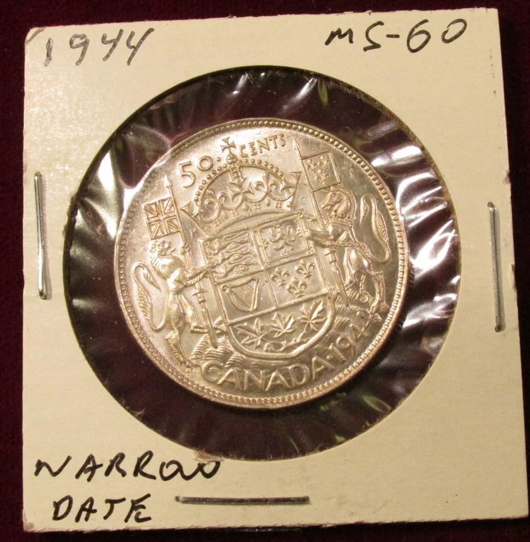 1944 Narrow Date Canada Silver Half Dollar. Unc. Catalog value $40.00.