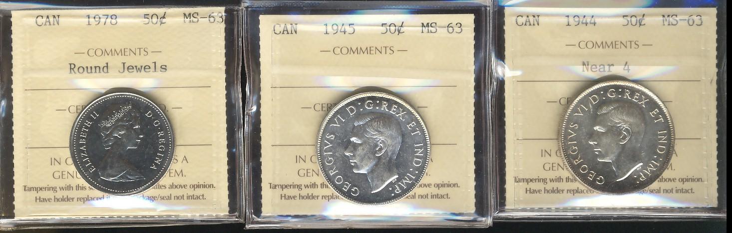 1944 Near 4, 1945, 1978 RB 50¢ all ICCS MS63, Lot of 3 coins,