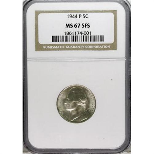<B>1944-P 5C MS67 Five Full Steps NGC.</B></I> Nearly 120 million 1944-P nickels were produced, but the issue is a strike rarity. In MS67 NGC has certified only a single piece as Six Full Steps, while just eight examples achieve the Five Full Steps level (4/07). The present Superb Gem has undisturbed fields, potent luster, and only a hint of ivory-gray toning.<BR><BR><b>Shipping:</b> Coins & Currency (<a target="_blank" href="http://www.heritageauctions.com/common/shipping.php">view shipping information</a>)