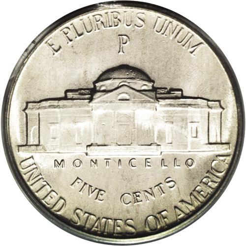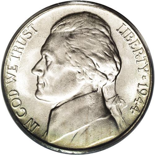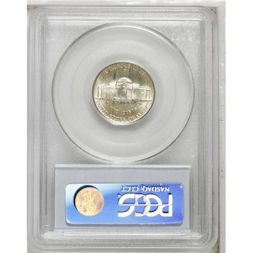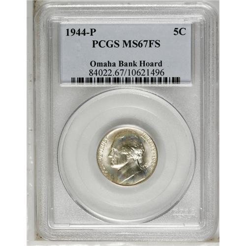 <B>1944-P<5C> MS67 Full Steps PCGS.</B></I> Ex: Omaha Bank Hoard. Fulsome mint frost is blanketed by delicate multicolored iridescence, particularly on the obverse. Distracting abrasions are all but nonexistent, but accuracy compels us to mention a not overly conspicuous mark near the lower obverse border at 6 o'clock. Population: 8 in 67, 0 finer (8/06).