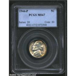 <TR><TD width="100%"><TABLE cellSpacing=1 cellPadding=3 width="100%" border=0><TBODY><TR><TD width="100%" bgColor=#79735c><FONT face=arial color=#ffffff size=3><B>Description</B> </FONT></TD></TR><TR><TD width="100%" bgColor=#ffffff><FONT face=arial size=2><B>1944-P 5C MS67 PCGS.</B></I> Bright frosty surfaces with hints of rainbow colorations on each side. A Superb, fully original specimen. </FONT></TD></TR></TBODY></TABLE></TD></TR></TBODY></TABLE><BR><A name=PricesRealized></A><TABLE cellSpacing=0 cellPadding=0 width="100%" bgColor=#000000 border=0><TBODY><TR><TD width="100%"><TABLE cellSpacing=1 cellPadding=3 width="100%" border=0><TBODY><TR><TD width="100%" bgColor=#79735c><A name=PR><FONT face=arial color=#ffffff size=3><B>Previous Prices from Heritage Auctions</B> </FONT></A></TD></TR><TR><TD bgColor=#f6f6ed><TABLE cellSpacing=0 cellPadding=0 width="100%" border=1><TBODY><TR><TD align=middle width="33%"><B>Date</B></TD><TD align=middle width="33%"><B>Service</B></TD><TD align=middle width="33%"><B>Price</B></TD></TR><TR bgColor=whitesmoke><TD width="33%"><B>09/24/2002</B></TD><TD width="33%">NGC</TD><TD width="33%">$47.15</TD></TR><TR bgColor=whitesmoke><TD width="33%"><B>04/09/2002</B></TD><TD width="33%">NGC</TD><TD width="33%">$21.85</TD></TR><TR bgColor=whitesmoke><TD width="33%"><B>04/09/2002</B></TD><TD width="33%">NGC</TD><TD width="33%">$26.45</TD></TR><TR bgColor=whitesmoke><TD width="33%"><B>10/16/2001</B></TD><TD width="33%">NGC</TD><TD width="33%">$21.00</TD></TR><TR bgColor=whitesmoke><TD width="33%"><B>08/15/2000</B></TD><TD width="33%">NGC</TD><TD width="33%">$40.00</TD></TR><TR bgColor=whitesmoke><TD width="33%"><B>04/08/2003</B></TD><TD width="33%">NGC</TD><TD width="33%">$39.10</TD></TR></TBODY></TABLE></TD></TR><TR><TD bgColor=#ffffff><FONT face=arial size=1 ?>PLEASE NOTE: All prices realized reflect the final hammer price PLUS the buyer's premium in auctions that charge a buyer's premium. Each item has a notation at the top of the listing indicating whether that lot included a buyer's premium. Example: A item that sells with a final hammer price of $100 and a 20% buyer's premium will display with a price realized of $120. All information listed is intended to be as accurate as possible, but errors are possible. Please use this guide carefully and inform us of any inaccuracies. </FONT></TD></TR></TBODY></TABLE></TD></TR></TBODY></TABLE><BR><TABLE cellSpacing=0 cellPadding=0 width="100%" bgColor=#000000 border=0><TBODY><TR><TD width="100%"><TABLE cellSpacing=1 cellPadding=3 width="100%" border=0><TBODY><TR><TD width="100%" bgColor=#79735c colSpan=6><FONT face=arial color=#ffffff size=3><B>Price Guide*</B> </FONT></TD></TR><TR bgColor=#f6f6ed><TD align=middle><B>Grade</B> </TD><TD align=middle><B>Coin World<BR>(Trends)</B> </TD><TD align=middle><B>Numismedia<BR>Retail</B> </TD><TD align=middle><B>Numismedia<BR>Wholesale</B> </TD><TD align=middle><B>Coin<BR>Universe</B> </TD><TD align=middle><B>Heritage<BR>Value Index</B> </TD></TR><TR bgColor=#ffffff><TD align=middle>66</TD><TD align=right>---</TD><TD align=right>$39.00</TD><TD align=right>$30.00</TD><TD align=right>$60.00</TD><TD align=right>$42.00</TD></TR><TR style="FONT-WEIGHT: bold" bgColor=#cccfdd><TD align=middle>67</TD><TD align=right>---</TD><TD align=right>$56.00</TD><TD align=right>$43.00</TD><TD align=right>---</TD><TD align=right>---</TD></TR><TR bgColor=#ffffff><TD align=middle>68</TD><TD align=right>---</TD><TD align=right>---</TD><TD align=right>---</TD><TD align=right>---</TD><TD align=right>---</TD></TR><TR bgColor=#ffffff><TD colSpan=6><FONT size=1>*All information listed is intended to be as accurate as possible, but errors are possible. No item may be returned or refused based on this information which is provided as a service to our customers. You should contact each pricing source directly to determine the accuracy of this information. </FONT></TD></TR></TBODY></TABLE></TD></TR></TBODY></TABLE><BR><TABLE cellSpacing=0 cellPadding=0 width="100%" bgColor=#000000 border=0><TBODY><TR><TD width="100%"><TABLE cellSpacing=1 cellPadding=3 width="100%" border=0><TBODY><TR><TD width="100%" bgColor=#79735c><FONT face=arial color=#ffffff size=3><B>Population Guide</B> </FONT></TD></TR><TR bgColor=#ffffff><TD align=middle><!-- Begin Output of Population Grid--><TABLE cellSpacing=0 cellPadding=0 width="100%" border=0><TBODY><TR><TD vAlign=center><TABLE cellSpacing=0 width="100%" border=1 cellsadding="3"><TBODY><TR><TD vAlign=center><TABLE cellSpacing=0 cellPadding=3 width="100%" border=1><TBODY><TR><TD vAlign=center align=middle bgColor=#f0f1e8 colSpan=2 <CENTER><FONT face=Arial size=2><B>PCGS Pop </B></FONT><CENTER></CENTER></TD><TD vAlign=center align=middle bgColor=#f0f1e8 colSpan=2><CENTER><FONT face=Arial size=2><B>NGC Pop</B></CENTER></FONT></TD></TR><TR><TD vAlign=center><FONT face=Arial size=2>(67)</FONT> </TD><TD vAlign=center align=right><FONT face=Arial size=2>5</FONT> </TD><TD vAlign=center><FONT face=Arial size=2>(67)</FONT> </TD><TD vAlign=center align=right><FONT face=Arial size=2>616</FONT> </TD></TR><TR><TD vAlign=center><FONT face=Arial size=2>(>67)</FONT> </TD><TD vAlign=center align=right><FONT face=Arial size=2>0</FONT> </TD><TD vAlign=center><FONT face=Arial size=2>(>67)</FONT> </TD><TD vAlign=center align=right><FONT face=Arial size=2>0</FONT> </TD></TR></TBODY></TABLE></TD></TR></TBODY></TABLE></TD></TR></TBODY></TABLE><!-- End Output of Population Grid--></TD></TR></TBODY></TABLE></TD></TR></TBODY></TABLE><BR><TABLE cellSpacing=0 cellPadding=0 width="100%" bgColor=#000000 border=0><TBODY><TR> Important notice: We expect to be auctioning lots at the rate of 200-250 per hour. On occasion eBay live bid software cannot keep up with the pace of the auctions where 4-5 lots per minute can hammer down, so we recommend that you place a realistic absentee bid now as insurance to avoid disappointment. Also please note that all Heritage/CAA lots purchased through eBay Live carry a 20% Buyer's
