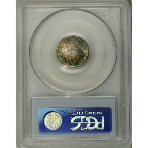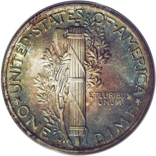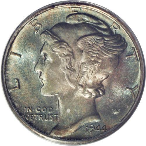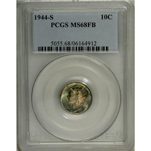 <B>1944-S 10C MS68 Full Bands PCGS.</B></I> The scarce Knob S variety. Sea-green, lemon, and rose-gold shades adorn this lustrous Superb Gem. Since the surfaces are pristine, the only feature that denies perfection is the strike, which is sharp on the all-important bands but slightly incomplete near the rims. Population: 4 in 68, 0 finer (11/06).<BR><BR><b>Shipping:</b> Coin/Currency (<a target="_blank" href="http://www.heritageauctions.com/common/shipping.php">view shipping information</a>)
