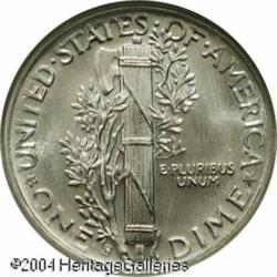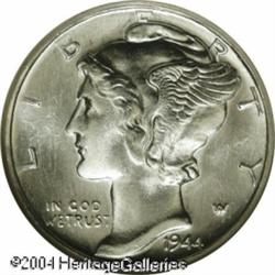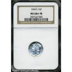 1944-S 10C MS68 S Full Bands NGC. Untoned with gl <B>1944-S 10C MS68 S Full Bands NGC.</B></I> Untoned with glistening, silver-white surfaces, both sides are uncommonly smooth for this otherwise easily obtainable S-mint issue. Fully brought up in all areas with eye appeal to spare. Both major grading services report just seven coins at the present graded level, and there are none finer (11/04). <BR><BR><B>Important notice:</B> Heritage usually auctions material at the rate of 200-250 lots per hour. On some occasions eBay Live bid software or the Internet may not be able to keep up with the pace of the auction. We recommend placing a realistic absentee bid now as insurance to avoid disappointment. Occasionally the auctioneer may eliminate or reject an eBay Live bid, and the auctioneer may also reopen a lot after the close of the eBay live bidding (usually because we missed an audience bid), and may reject your bid even if it shows you as the winning bidder. By bidding via eBay Live, you agree that Heritage may award the lot to another bidder at its sole discretion under the circumstances described above or any other reasonable circumstances. Since eBay bids are not shown to us until we open the lot on the floor, we treat those bids just like floor bids. In most cases the floor responds before the eBay bid is presented to us, due to Internet lag time, so for consistency we have made it a policy that floor bids are always considered first over tie eBay live bids. Also please note that all Heritage lots purchased through eBay Live carry a 20% Buyer's Premium. Please make sure you read the Terms and Conditions before you bid. This lot is being auctioned in conjunction with a live floor auction by Heritage Galleries & Auctioneers. All final auction and invoice information will be supplied by Heritage Galleries & Auctioneers, and all other information should be considered preliminary. Lot:5837