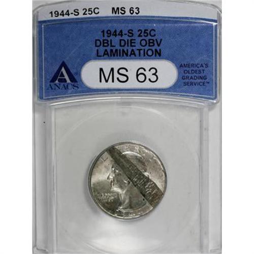 <B>1944-S 25C Washington Quarter Double Die Obverse--Lamination--MS63 ANACS.</B></I> <BR><BR><B>Coin Engraver:</B> John Flanagan<BR><BR><b>Shipping:</b> Coins & Currency (<a target="_blank" href="http://www.heritageauctions.com/common/shipping.php">view shipping information</a>)