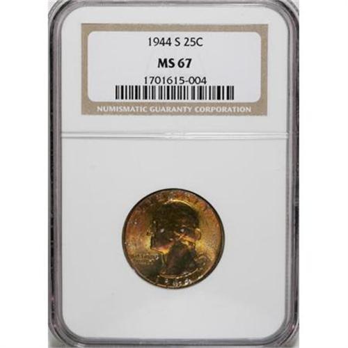 <B>1944-S 25C MS67 NGC.</B></I> NGC Census: (245/3). PCGS Population (55/2). Mintage: 12,560,000. Numismedia Wsl. Price for NGC/PCGS coin in MS67: $340. (#5826)<BR><BR><B>Coin Engraver:</B> John Flanagan<BR><BR><b>Shipping:</b> Coins & Currency (<a target="_blank" href="http://www.heritageauctions.com/common/shipping.php">view shipping information</a>)