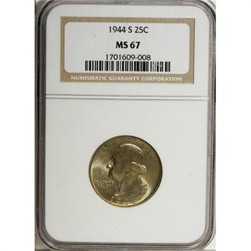 <B>1944-S 25C MS67 NGC.</B></I> NGC Census: (245/3). PCGS Population (56/2). Mintage: 12,560,000. Numismedia Wsl. Price for NGC/PCGS coin in MS67: $340. (#5826)<BR><BR><B>Coin Engraver:</B> John Flanagan<BR><BR><b>Shipping:</b> Coins & Currency (<a target="_blank" href="http://www.heritageauctions.com/common/shipping.php">view shipping information</a>)