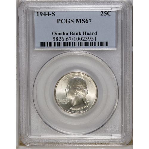 1944-S 25C MS67 PCGS. Ex: Omaha Bank Hoard. Frosty sur