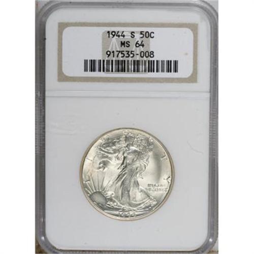 <B>1944-S 50C MS64 NGC.</B></I> NGC Census: (2912/1178). PCGS Population (3510/2443). Mintage: 8,904,000. Numismedia Wsl. Price for NGC/PCGS coin in MS64: $76. (#6623)<BR><BR><B>Coin Engraver:</B> Adolph A. Weinman<BR><BR><b>Shipping:</b> Coins & Currency (<a target="_blank" href="http://www.heritageauctions.com/common/shipping.php">view shipping information</a>)