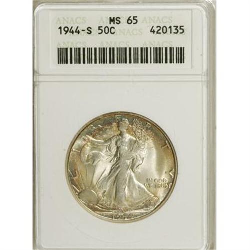 <B>1944-S 50C MS65 ANACS.</B></I> NGC Census: (1029/149). PCGS Population (2144/311). Mintage: 8,904,000. Numismedia Wsl. Price for NGC/PCGS coin in MS65: $390. (#6623)<BR><BR><B>Coin Engraver:</B> Adolph A. Weinman<BR><BR><b>Shipping:</b> Coins & Currency (<a target="_blank" href="http://www.heritageauctions.com/common/shipping.php">view shipping information</a>)