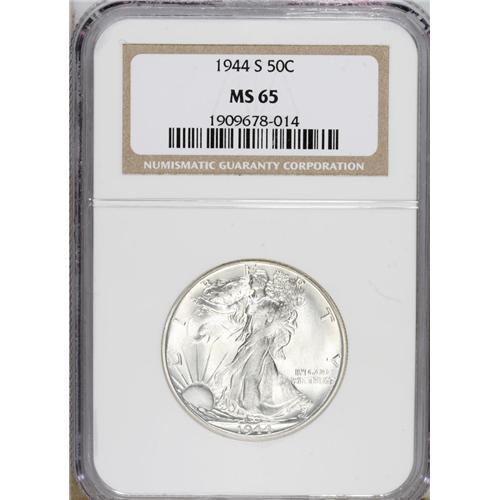 <B>1944-S 50C MS65 NGC.</B></I> NGC Census: (1021/139). PCGS Population (2108/294). Mintage: 8,904,000. Numismedia Wsl. Price: $440. (#6623)<BR><BR><b>Shipping:</b> Coins & Currency (<a target="_blank" href="http://www.heritageauctions.com/common/shipping.php">view shipping information</a>)