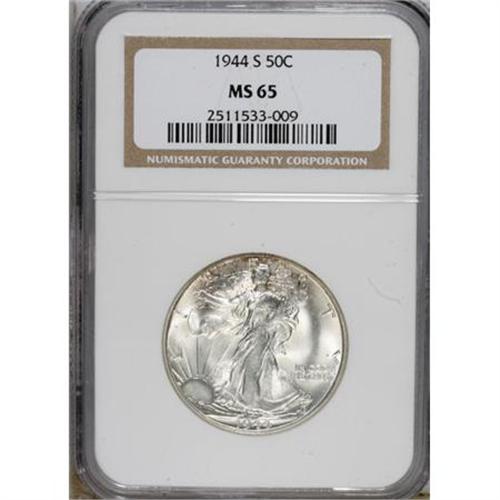 <B>1944-S 50C MS65 NGC.</B></I> NGC Census: (1027/146). PCGS Population (2101/295). Mintage: 8,904,000. Numismedia Wsl. Price for NGC/PCGS coin in MS65: $420. (#6623)<BR><BR><b>Shipping:</b> Coins & Currency (<a target="_blank" href="http://www.heritageauctions.com/common/shipping.php">view shipping information</a>)