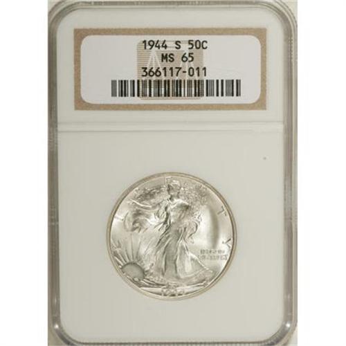 <B>1944-S 50C MS65 NGC.</B></I> NGC Census: (1027/146). PCGS Population (2101/295). Mintage: 8,904,000. Numismedia Wsl. Price for NGC/PCGS coin in MS65: $420. (#6623)<BR><BR><b>Shipping:</b> Coins & Currency (<a target="_blank" href="http://www.heritageauctions.com/common/shipping.php">view shipping information</a>)