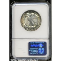 <B>1944-S<50C> MS65 NGC.</B></I> A cataloger's choice coin. If I were collecting Walkers, they would look like this. Frosty silver luster gradually giving way to delightfully intermingled amber, gold, lilac, blue, and green on both sides. Seeing is believing, and if you see this coin we believe you'll like it. <BR><BR><B>Important notice:</B> Heritage usually auctions material at the rate of 200-250 lots per hour. On some occasions eBay Live bid software or the Internet may not be able to keep up with the pace of the auction. We recommend placing a realistic absentee bid now as insurance to avoid disappointment. Occasionally the auctioneer may eliminate or reject an eBay Live bid, and the auctioneer may also reopen a lot after the close of the eBay live bidding (usually because we missed an audience bid), and may reject your bid even if it shows you as the winning bidder. By bidding via eBay Live, you agree that Heritage may award the lot to another bidder at its sole discretion under the circumstances described above or any other reasonable circumstances. Since eBay bids are not shown to us until we open the lot on the floor, we treat those bids just like floor bids. In most cases the floor responds before the eBay bid is presented to us, due to Internet lag time, so for consistency we have made it a policy that floor bids are always considered first over tie eBay live bids. Also please note that all Heritage lots purchased through eBay Live carry a 20% Buyer's Premium. Please make sure you read the Terms and Conditions before you bid. </span></font></tr></table></td></tr></table>
