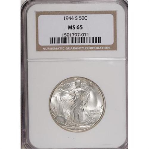 <B>1944-S 50C MS65 NGC.</B></I> NGC Census: (1034/162). PCGS Population (2211/326). Mintage: 8,904,000. Numismedia Wsl. Price for NGC/PCGS coin in MS65: $380. (#6623)<BR><BR><B>Coin Engraver:</B> Adolph A. Weinman<BR><BR><b>Shipping:</b> Coins & Currency (<a target="_blank" href="http://www.heritageauctions.com/common/shipping.php">view shipping information</a>)