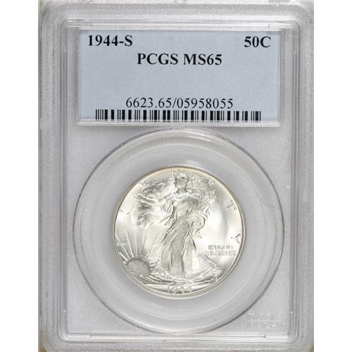 <B>1944-S 50C MS65 PCGS.</B></I> A hint of ice-blue patina in the fields adds color to the shining silver-white surfaces of this key short-set Gem. Modestly marked with typical softness at the branch hand and the corresponding zone on the eagle's leg.<BR><BR><b>Shipping:</b> Coins & Currency (<a target="_blank" href="http://www.heritageauctions.com/common/shipping.php">view shipping information</a>)