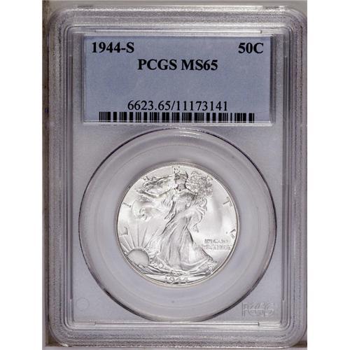 <B>1944-S<50C> MS65 PCGS.</B></I> Brilliant surfaces exhibit dazzling luster, and are minimally abraded. The design elements are adequately brought up. <BR><BR><B>Important notice:</B> Heritage usually auctions material at the rate of 200-250 lots per hour. On some occasions eBay Live bid software or the Internet may not be able to keep up with the pace of the auction. We recommend placing a realistic absentee bid now as insurance to avoid disappointment. Occasionally the auctioneer may eliminate or reject an eBay Live bid, and the auctioneer may also reopen a lot after the close of the eBay live bidding (usually because we missed an audience bid), and may reject your bid even if it shows you as the winning bidder. By bidding via eBay Live, you agree that Heritage may award the lot to another bidder at its sole discretion under the circumstances described above or any other reasonable circumstances. Since eBay bids are not shown to us until we open the lot on the floor, we treat those bids just like floor bids. In most cases the floor responds before the eBay bid is presented to us, due to Internet lag time, so for consistency we have made it a policy that floor bids are always considered first over tie eBay live bids. Also please note that all Heritage lots purchased through eBay Live carry a 20% Buyer's Premium. Please make sure you read the Terms and Conditions before you bid. This lot is being auctioned in conjunction with a live floor auction by Heritage Galleries & Auctioneers. All final auction and invoice information will be supplied by Heritage Galleries & Auctioneers, and all other information should be considered preliminary. Lot:3015 <BR><BR><B>Winning Notification and Billing:</B> After the FINAL session in this auction is complete, Heritage will send e-mail and snail mail invoices. This process normally takes several days. All final auction and invoice information will be supplied by Heritage Galleries & Auctioneers, and all other information should be considered preliminary. <BR><BR>This auction will be conducted on a live auction floor and over the Internet through eBay Live. If you choose to place an absentee bid, please take a moment to <font color='#0000ff'><u><a href='http://pages.ebay.com/liveauctions/help/before/laabsentee.html'>learn how eBay Live absentee bidding works</a></u></font><font color='#000000'>