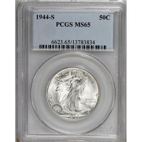 <B>1944-S 50C MS65 PCGS.</B></I> Large S. This impressive Gem is brilliant with dazzling luster. The obverse field is striated, as made, and abrasions are essentially absent. Liberty's head has a bold strike, while the upper skirt lines and branch hand show expected merging of detail.<BR><BR><B>Coin Engraver:</B> Adolph A. Weinman<BR><BR><b>Shipping:</b> Coins & Currency (<a target="_blank" href="http://www.heritageauctions.com/common/shipping.php">view shipping information</a>)