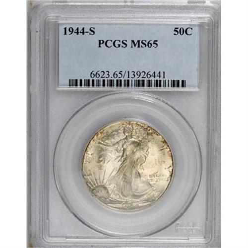 <B>1944-S 50C MS65 PCGS.</B></I> PCGS Population (2162/317). NGC Census: (1029/149). Mintage: 8,904,000. Numismedia Wsl. Price for NGC/PCGS coin in MS65: $390. (#6623)<BR><BR><B>Coin Engraver:</B> Adolph A. Weinman<BR><BR><b>Shipping:</b> Coins & Currency (<a target="_blank" href="http://www.heritageauctions.com/common/shipping.php">view shipping information</a>)