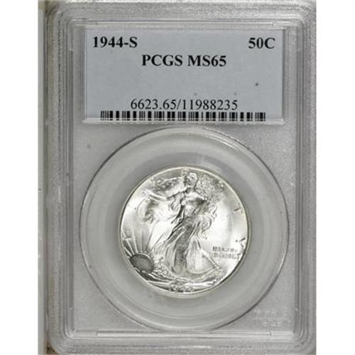 <B>1944-S 50C MS65 PCGS.</B></I> PCGS Population (2211/326). NGC Census: (1032/161). Mintage: 8,904,000. Numismedia Wsl. Price for NGC/PCGS coin in MS65: $380. (#6623)<BR><BR><B>Coin Engraver:</B> Adolph A. Weinman<BR><BR><b>Shipping:</b> Coins & Currency (<a target="_blank" href="http://www.heritageauctions.com/common/shipping.php">view shipping information</a>)