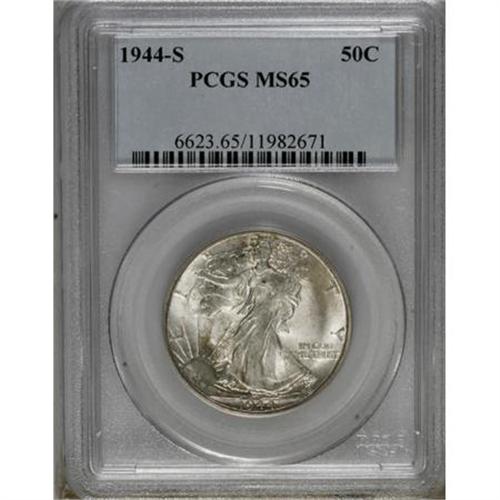 <B>1944-S 50C MS65 PCGS.</B></I> PCGS Population (2211/326). NGC Census: (1034/162). Mintage: 8,904,000. Numismedia Wsl. Price for NGC/PCGS coin in MS65: $380. (#6623)<BR><BR><B>Coin Engraver:</B> Adolph A. Weinman<BR><BR><b>Shipping:</b> Coins & Currency (<a target="_blank" href="http://www.heritageauctions.com/common/shipping.php">view shipping information</a>)