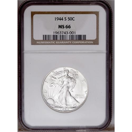<B>1944-S<50C> MS66 NGC.</B></I> Large S. A fully brilliant and thoroughly lustrous Premium Gem. The reverse is particularly well preserved. The strike is above average on Liberty's head and skirt lines, and shows the expected softness on the branch hand.