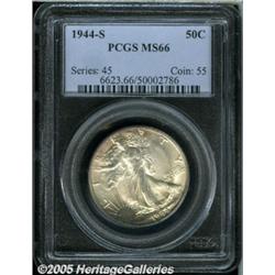 <B>1944-S 50C MS66 PCGS.</B></I> A shimmering Gem with rich luster and virtually mark-free surfaces, this later date S-mint Walking Liberty half is brilliant in the centers, with hints of light golden iridescence in the peripheries and splashes of russet along the reverse rims. While a number of coins have been graded at MS66 by both of the major grading services, only a handful have been graded any finer.