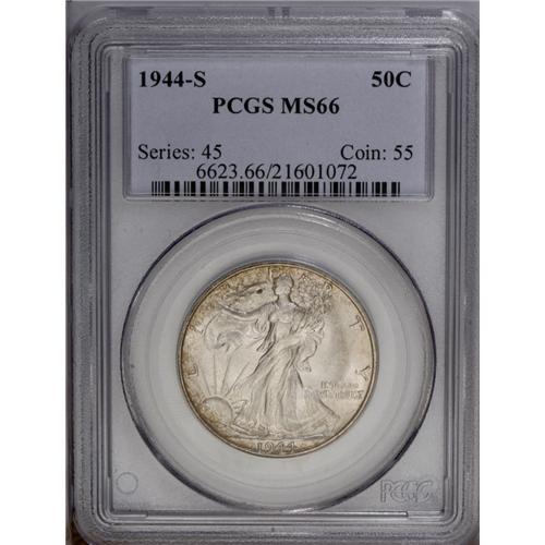 <B>1944-S<50C> MS66 PCGS.</B></I> Large S. A lustrous and remarkably preserved Premium Gem with golden-brown borders and cream-gray centers. The strike is typical on Liberty's head and branch hand. PCGS has graded only five specimens finer (2/06).