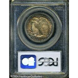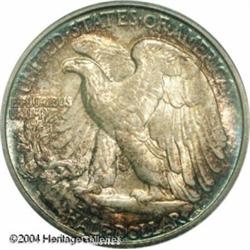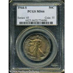 1944-S 50C MS66 PCGS. Large S mintmark. Vividly to <B>1944-S 50C MS66 PCGS.</B></I> Large S mintmark. Vividly toned in electric-blue, forest-green, ruby-red, and apricot colors, this shimmering premium Gem has a nearly pristine reverse and a very clean obverse. Liberty's head is bold, and the branch hand is better defined than on a sizeable majority of S-mint Walkers from the forties. As of (10/04), a mere four pieces have been certified finer by PCGS. <BR><BR><B>Important notice:</B> Heritage usually auctions material at the rate of 200-250 lots per hour. On some occasions eBay Live bid software or the Internet may not be able to keep up with the pace of the auction. We recommend placing a realistic absentee bid now as insurance to avoid disappointment. Occasionally the auctioneer may eliminate or reject an eBay Live bid, and the auctioneer may also reopen a lot after the close of the eBay live bidding (usually because we missed an audience bid), and may reject your bid even if it shows you as the winning bidder. By bidding via eBay Live, you agree that Heritage may award the lot to another bidder at its sole discretion under the circumstances described above or any other reasonable circumstances. Since eBay bids are not shown to us until we open the lot on the floor, we treat those bids just like floor bids. In most cases the floor responds before the eBay bid is presented to us, due to Internet lag time, so for consistency we have made it a policy that floor bids are always considered first over tie eBay live bids. Also please note that all Heritage lots purchased through eBay Live carry a 20% Buyer's Premium. Please make sure you read the Terms and Conditions before you bid. This lot is being auctioned in conjunction with a live floor auction by Heritage Galleries & Auctioneers. All final auction and invoice information will be supplied by Heritage Galleries & Auctioneers, and all other information should be considered preliminary. Lot:6255
