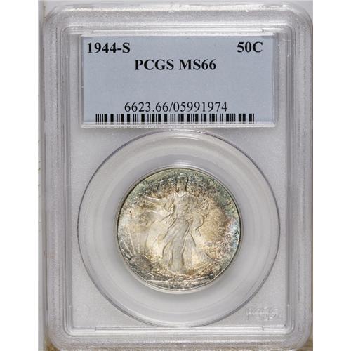 <B>1944-S 50C MS66 PCGS.</B></I> Speckles of cobalt-blue, golden-brown, and violet around the borders frame brilliant centers. Lustrous surfaces exhibit adequately struck design features. A mere five coins have been seen finer by PCGS. (11/05).<BR><BR><b>Shipping:</b> Coin/Currency (<a target="_blank" href="http://www.heritageauctions.com/common/shipping.php">view shipping information</a>)