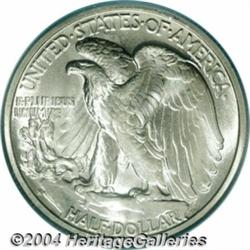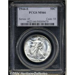 <B>1944-S<50C> MS66 PCGS.</B></I> The striking details are above average for this notoriously weak issue. The mint luster is exceptional, as always, and the surfaces are bright and untoned. There are no obvious abrasions on either side of this lovely, high grade example. Population: 170 in 66, 5 finer (3/04). <BR><BR><B>Important notice:</B> Heritage usually auctions material at the rate of 200-250 lots per hour. On some occasions eBay Live bid software or the Internet may not be able to keep up with the pace of the auction. We recommend placing a realistic absentee bid now as insurance to avoid disappointment. Occasionally the auctioneer may eliminate or reject an eBay Live bid, and the auctioneer may also reopen a lot after the close of the eBay live bidding (usually because we missed an audience bid), and may reject your bid even if it shows you as the winning bidder. By bidding via eBay Live, you agree that Heritage may award the lot to another bidder at its sole discretion under the circumstances described above or any other reasonable circumstances. Since eBay bids are not shown to us until we open the lot on the floor, we treat those bids just like floor bids. In most cases the floor responds before the eBay bid is presented to us, due to Internet lag time, so for consistency we have made it a policy that floor bids are always considered first over tie eBay live bids. Also please note that all Heritage lots purchased through eBay Live carry a 20% Buyer's Premium. Please make sure you read the Terms and Conditions before you bid. </span></font></tr></table></td></tr></table>
