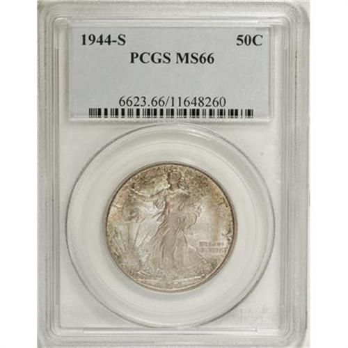 <B>1944-S 50C MS66 PCGS.</B></I> Large S. Lavishly patinated in caramel-gold, aqua-blue, and gunmetal-gray. A well preserved Premium Gem with a sharply struck head and pleasing skirt definition. The branch hand is soft, as usual for the issue.<BR><BR><b>Shipping:</b> Coins & Currency (<a target="_blank" href="http://www.heritageauctions.com/common/shipping.php">view shipping information</a>)