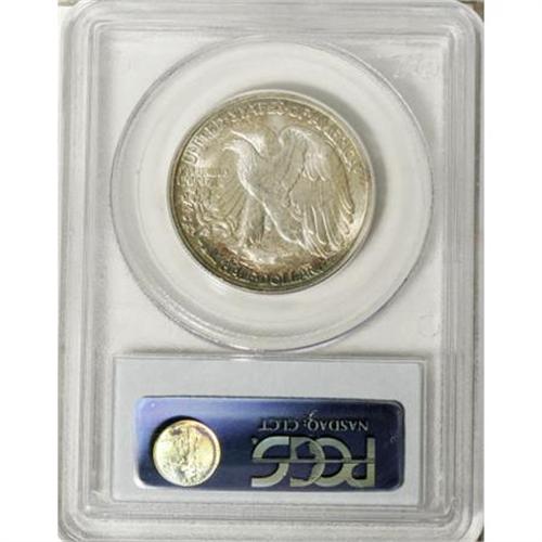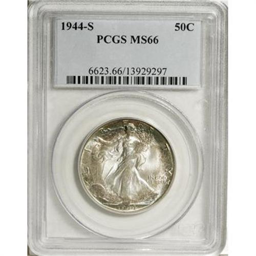 <B>1944-S 50C MS66 PCGS.</B></I> Well struck with soft, pleasing luster and ample blue-green, tan, and violet toning at the margins. An attractive, high-end example of this S-mint short-set issue. PCGS has graded five coins finer (10/07).<BR><BR><B>Coin Engraver:</B> Adolph A. Weinman<BR><BR><b>Shipping:</b> Coins & Currency (<a target="_blank" href="http://www.heritageauctions.com/common/shipping.php">view shipping information</a>)