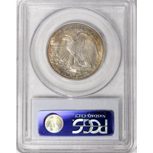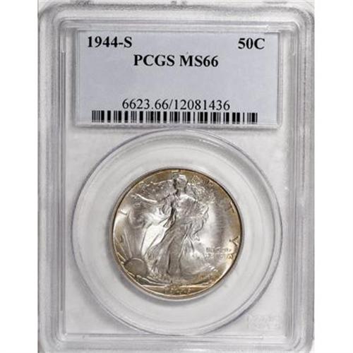 <B>1944-S 50C MS66 PCGS.</B></I> Large S. This nearly immaculate Premium Gem is bathed in luxurious golden-brown, sky-blue, and aqua shades. Luster sweeps the undisturbed surfaces. The branch hand is somewhat soft, as is customary for this wartime S-mint issue.<BR><BR><B>Coin Engraver:</B> Adolph A. Weinman<BR><BR><b>Shipping:</b> Coins & Currency (<a target="_blank" href="http://www.heritageauctions.com/common/shipping.php">view shipping information</a>)