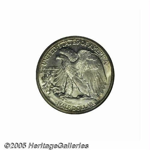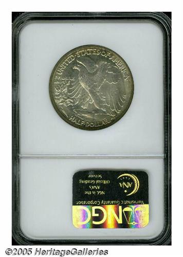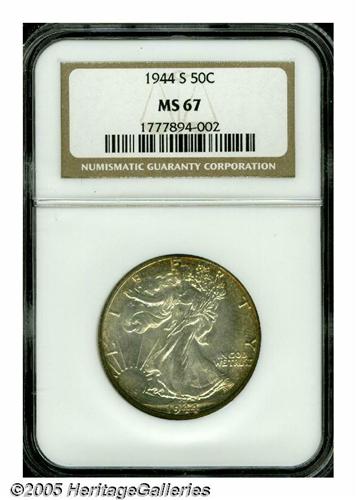 <B>1944-S<50C> MS67 NGC.</B></I> With just a little imagination, all of the skirt lines may be seen, although some are virtually gone. Even Liberty's thumb is partially outlined. The specialist will understand what this means, for nearly every existing example of this issue has drastic central weakness. This example has outstanding eye appeal with satiny silver luster and peripheral gold toning, mostly on the obverse. Tied for finest certified. Population: 4 in 67, 0 finer (6/05).<BR><I>From The Robert Moreno Collection.</B></I>
