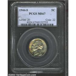 <TABLE cellSpacing=0 cellPadding=0 width="100%" bgColor=#000000 border=0><TBODY><TR><TD width="100%"><TABLE cellSpacing=1 cellPadding=3 width="100%" border=0><TBODY><TR><TD width="100%" bgColor=#79735c><FONT face=arial color=#ffffff size=3><B>Description</B> </FONT></TD></TR><TR><TD width="100%" bgColor=#ffffff><FONT face=arial size=2><B>1944-S 5C MS67 PCGS.</B></I> Highly lustrous with a colorful overlay of multicolored iridescence. One contact mark is seen on Jefferson's cheek. </FONT></TD></TR></TBODY></TABLE></TD></TR></TBODY></TABLE><BR><A name=PricesRealized></A><TABLE cellSpacing=0 cellPadding=0 width="100%" bgColor=#000000 border=0><TBODY><TR><TD width="100%"><TABLE cellSpacing=1 cellPadding=3 width="100%" border=0><TBODY><TR><TD width="100%" bgColor=#79735c><A name=PR><FONT face=arial color=#ffffff size=3><B>Previous Prices from Heritage Auctions</B> </FONT></A></TD></TR><TR><TD bgColor=#f6f6ed><TABLE cellSpacing=0 cellPadding=0 width="100%" border=1><TBODY><TR><TD align=middle width="33%"><B>Date</B></TD><TD align=middle width="33%"><B>Service</B></TD><TD align=middle width="33%"><B>Price</B></TD></TR><TR bgColor=whitesmoke><TD width="33%"><B>11/19/2002</B></TD><TD width="33%">NGC</TD><TD width="33%">$26.45</TD></TR><TR bgColor=whitesmoke><TD width="33%"><B>09/03/2002</B></TD><TD width="33%">NGC</TD><TD width="33%">$24.15</TD></TR><TR bgColor=whitesmoke><TD width="33%"><B>04/16/2002</B></TD><TD width="33%">NGC</TD><TD width="33%">$48.30</TD></TR><TR bgColor=whitesmoke><TD width="33%"><B>04/09/2002</B></TD><TD width="33%">NGC</TD><TD width="33%">$26.45</TD></TR><TR bgColor=whitesmoke><TD width="33%"><B>10/16/2001</B></TD><TD width="33%">NGC</TD><TD width="33%">$19.00</TD></TR><TR bgColor=whitesmoke><TD width="33%"><B>04/18/2000</B></TD><TD width="33%">NGC</TD><TD width="33%">$23.00</TD></TR><TR bgColor=whitesmoke><TD width="33%"><B>03/28/2000</B></TD><TD width="33%">NGC</TD><TD width="33%">$24.00</TD></TR><TR bgColor=whitesmoke><TD width="33%"><B>12/12/2000</B></TD><TD width="33%">ANACS</TD><TD width="33%">$21.00</TD></TR><TR bgColor=whitesmoke><TD width="33%"><B>04/08/2003</B></TD><TD width="33%">NGC</TD><TD width="33%">$25.30</TD></TR></TBODY></TABLE></TD></TR><TR><TD bgColor=#ffffff><FONT face=arial size=1 ?>PLEASE NOTE: All prices realized reflect the final hammer price PLUS the buyer's premium in auctions that charge a buyer's premium. Each item has a notation at the top of the listing indicating whether that lot included a buyer's premium. Example: A item that sells with a final hammer price of $100 and a 20% buyer's premium will display with a price realized of $120. All information listed is intended to be as accurate as possible, but errors are possible. Please use this guide carefully and inform us of any inaccuracies. </FONT></TD></TR></TBODY></TABLE></TD></TR></TBODY></TABLE><BR><TABLE cellSpacing=0 cellPadding=0 width="100%" bgColor=#000000 border=0><TBODY><TR><TD width="100%"><TABLE cellSpacing=1 cellPadding=3 width="100%" border=0><TBODY><TR><TD width="100%" bgColor=#79735c colSpan=6><FONT face=arial color=#ffffff size=3><B>Price Guide*</B> </FONT></TD></TR><TR bgColor=#f6f6ed><TD align=middle><B>Grade</B> </TD><TD align=middle><B>Coin World<BR>(Trends)</B> </TD><TD align=middle><B>Numismedia<BR>Retail</B> </TD><TD align=middle><B>Numismedia<BR>Wholesale</B> </TD><TD align=middle><B>Coin<BR>Universe</B> </TD><TD align=middle><B>Heritage<BR>Value Index</B> </TD></TR><TR bgColor=#ffffff><TD align=middle>66</TD><TD align=right>---</TD><TD align=right>$31.00</TD><TD align=right>$24.00</TD><TD align=right>$35.00</TD><TD align=right>$20.25</TD></TR><TR style="FONT-WEIGHT: bold" bgColor=#cccfdd><TD align=middle>67</TD><TD align=right>---</TD><TD align=right>$55.00</TD><TD align=right>$42.00</TD><TD align=right>$85.00</TD><TD align=right>$40.75</TD></TR><TR bgColor=#ffffff><TD align=middle>68</TD><TD align=right>---</TD><TD align=right>---</TD><TD align=right>---</TD><TD align=right>---</TD><TD align=right>---</TD></TR><TR bgColor=#ffffff><TD colSpan=6><FONT size=1>*All information listed is intended to be as accurate as possible, but errors are possible. No item may be returned or refused based on this information which is provided as a service to our customers. You should contact each pricing source directly to determine the accuracy of this information. </FONT></TD></TR></TBODY></TABLE></TD></TR></TBODY></TABLE><BR><TABLE cellSpacing=0 cellPadding=0 width="100%" bgColor=#000000 border=0><TBODY><TR><TD width="100%"><TABLE cellSpacing=1 cellPadding=3 width="100%" border=0><TBODY><TR><TD width="100%" bgColor=#79735c><FONT face=arial color=#ffffff size=3><B>Population Guide</B> </FONT></TD></TR><TR bgColor=#ffffff><TD align=middle><!-- Begin Output of Population Grid--><TABLE cellSpacing=0 cellPadding=0 width="100%" border=0><TBODY><TR><TD vAlign=center><TABLE cellSpacing=0 width="100%" border=1 cellsadding="3"><TBODY><TR><TD vAlign=center><TABLE cellSpacing=0 cellPadding=3 width="100%" border=1><TBODY><TR><TD vAlign=center align=middle bgColor=#f0f1e8 colSpan=2 <CENTER><FONT face=Arial size=2><B>PCGS Pop </B></FONT><CENTER></CENTER></TD><TD vAlign=center align=middle bgColor=#f0f1e8 colSpan=2><CENTER><FONT face=Arial size=2><B>NGC Pop</B></CENTER></FONT></TD></TR><TR><TD vAlign=center><FONT face=Arial size=2>(67)</FONT> </TD><TD vAlign=center align=right><FONT face=Arial size=2>40</FONT> </TD><TD vAlign=center><FONT face=Arial size=2>(67)</FONT> </TD><TD vAlign=center align=right><FONT face=Arial size=2>1124</FONT> </TD></TR><TR><TD vAlign=center><FONT face=Arial size=2>(>67)</FONT> </TD><TD vAlign=center align=right><FONT face=Arial size=2>0</FONT> </TD><TD vAlign=center><FONT face=Arial size=2>(>67)</FONT> </TD><TD vAlign=center align=right><FONT face=Arial size=2>2</FONT> </TD></TR></TBODY></TABLE></TD></TR></TBODY></TABLE></TD></TR></TBODY></TABLE><!-- End Output of Population Grid--> Important notice: Heritage usually auctions material at the rate of 200-250 lots per