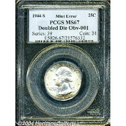 <B>1944-S Doubled Die Obverse MS67 PCGS.</B></I> FS-017. DDO 1-O-I. IN GOD WE TRUST exhibits the strongest doubling, although the date and LIBERTY are also die doubled. A silver-gray Superb Gem with a blush of vivid golden-brown patina throughout the date. Exceptionally preserved, although a small strike-thru (as made) is observed just above the first L in DOLLAR. <BR><BR><B>Important notice:</B> Heritage usually auctions material at the rate of 200-250 lots per hour. On some occasions eBay Live bid software or the Internet may not be able to keep up with the pace of the auction. We recommend placing a realistic absentee bid now as insurance to avoid disappointment. Occasionally the auctioneer may eliminate or reject an eBay Live bid, and the auctioneer may also reopen a lot after the close of the eBay live bidding (usually because we missed an audience bid), and may reject your bid even if it shows you as the winning bidder. By bidding via eBay Live, you agree that Heritage may award the lot to another bidder at its sole discretion under the circumstances described above or any other reasonable circumstances. Since eBay bids are not shown to us until we open the lot on the floor, we treat those bids just like floor bids. In most cases the floor responds before the eBay bid is presented to us, due to Internet lag time, so for consistency we have made it a policy that floor bids are always considered first over tie eBay live bids. Also please note that all Heritage lots purchased through eBay Live carry a 20% Buyer's Premium. Please make sure you read the Terms and Conditions before you bid.