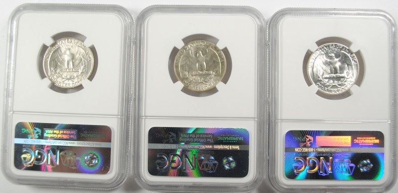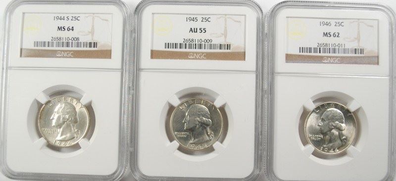 1944-S WASHINGTON QUARTER NGC MS-64, 1945 WASHINGTON QUARTER NGC AU-55 & 1946 WA