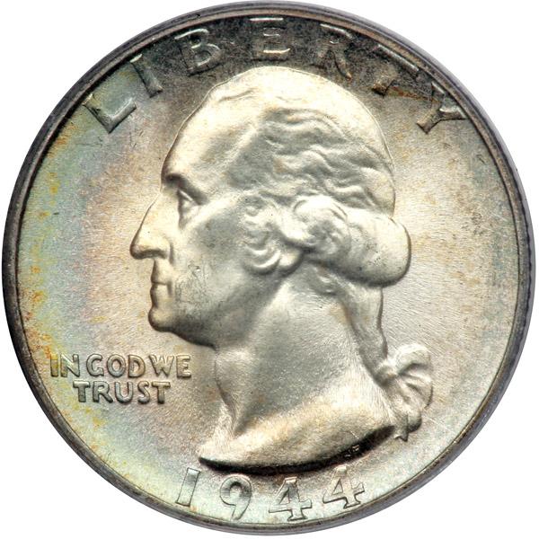 1944-S Washington Quarter Dollar. PCGS graded MS-67. Light blue obverse toning. A glittering Super Gem specimen for the connoisseur of the series. Pop 110; 8 finer (PCGS # 5826) .